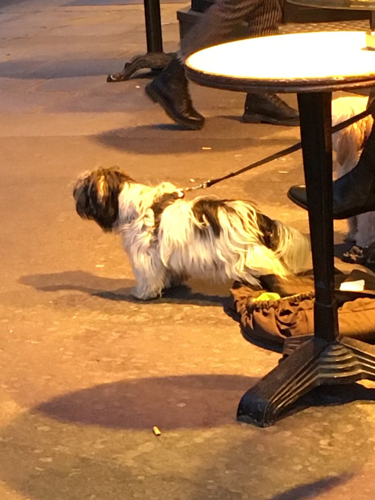 I needn’t have worried. The cafés were full of people eating, drinking, reading, writing, flirting, arguing, laughing. I went into a café de quartier, full of local people. I sat down ordered a pastis, picked up the paper and was taken back 30 years. I looked around, the café was full. There was a table of young people deep in conversation, they were animated and passionate, at another table a moody looking couple stared into each other’s eyes saying nothing. The evening was either going to end badly or very well. Something or someone had upset a group of middle aged men. Probably the President. The argument was passionate but good humoured. I settled down to my drink and my paper. It was going to be alright. Paris hadn’t changed. Just then an elderly woman sat down in the empty chair at my table. Something scratched at my leg. I looked down to see an oriental looking dog, a sort of scrawny pekingese with a protruding bottom jaw. His mistress looked at me and growled “That’s his spot” . Before I could reply the dog was on my lap, looking very pleased with himself. He settled down with a long sigh. I smiled to myself. Yes, Paris was still different from other cities. I finished my drink and went out in search of dinner. The streets were full, not just with people rushing to get somewhere, but with people enjoying their city. Doing ordinary things but somehow making them look extraordinary.