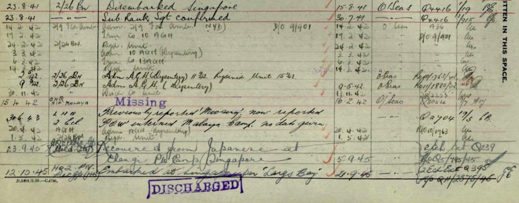 He signed up on March 2nd 1940. He was made a prisoner of war in February 1942 in Malaya. He was then listed as missing and it may be during this period of 14 months that he was working on the Death Railway. He was recovered from the Japanese at Changi on September 23, 1945 and repatriated to Australia. He lived in very poor health for another 19 years until his death in 1964.
