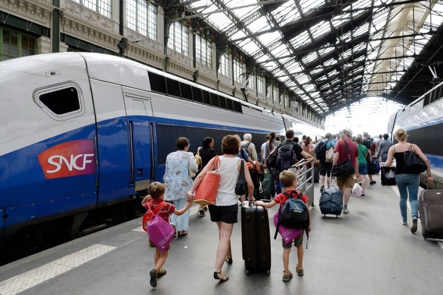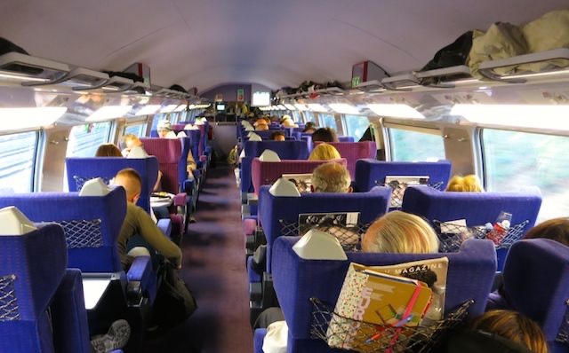 In the train everyone is looking for their seats and stowing their luggage. The atmosphere is febrile. Then the doors close, the train glides out of the station, calm descends.