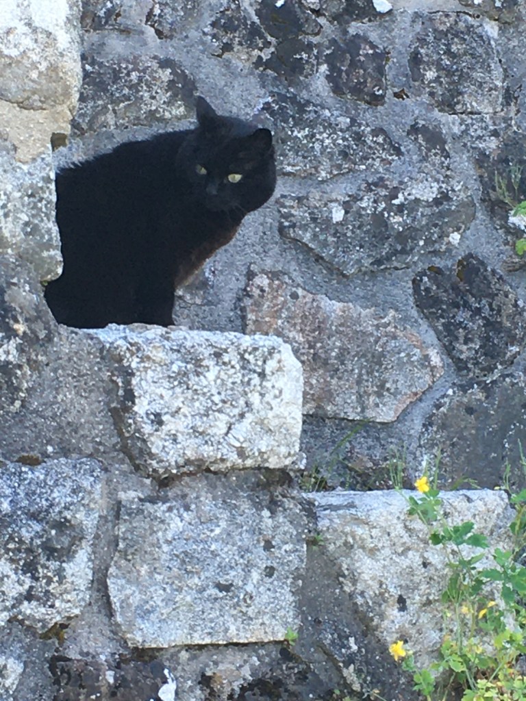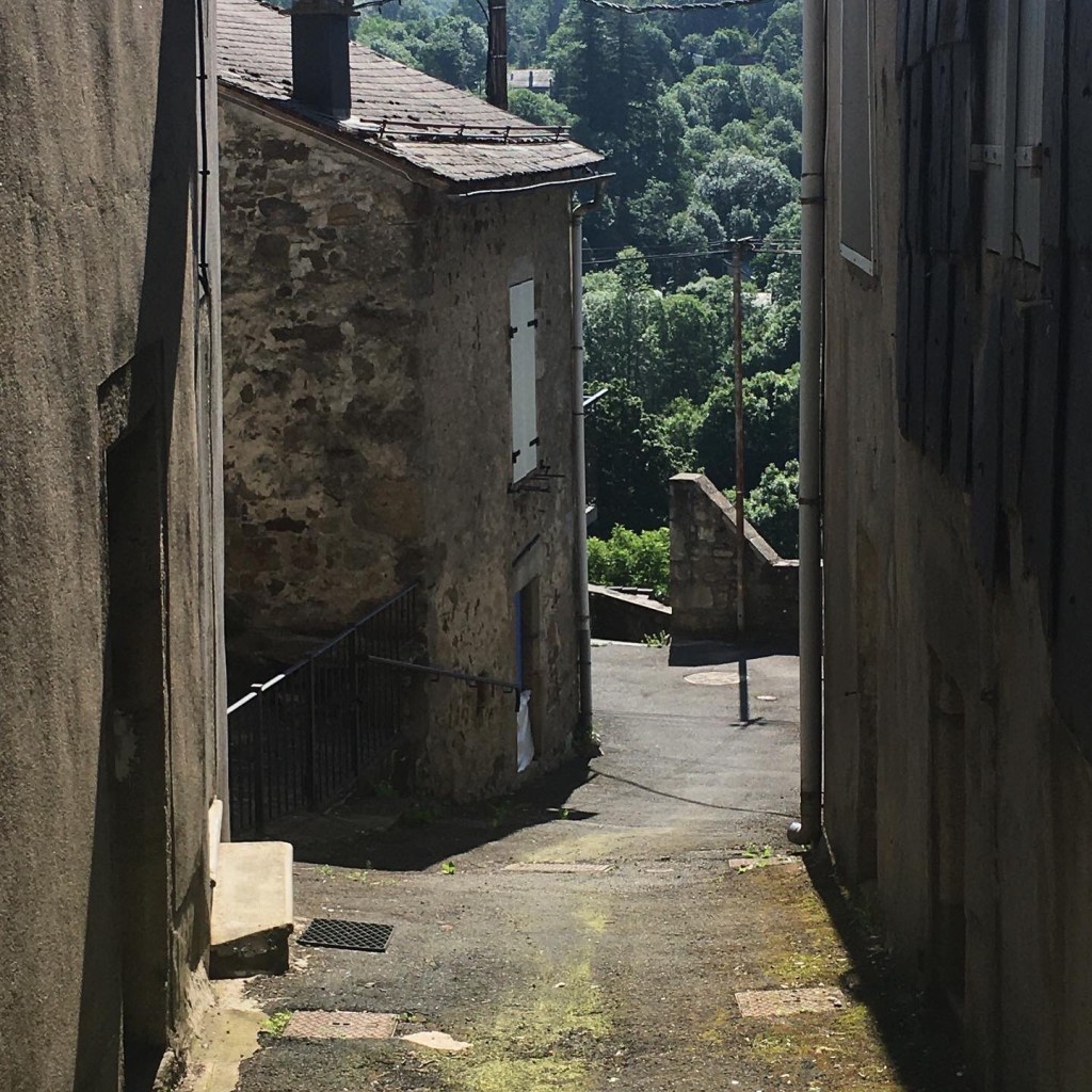 We had promised ourselves breakfast out in the small town of La Salvetat-sur-Agout so we dressed and set off on foot. The walk took us by a pretty stretch of river. A green headed mallard trod water for a moment before allowing himself to be swept downstream, his quack sounding like excited laughter as he sped backwards. We continued up a steep, stone stairway to the hilltop town. Cats were warming themselves on the sunny steps, stretching out and rolling onto their backs, reaching indolently towards the sun as if to pull it closer. As we advanced they shot us reproachful looks and jumped out of our path, watching resentfully until we had passed and they could resume their sunbathing.