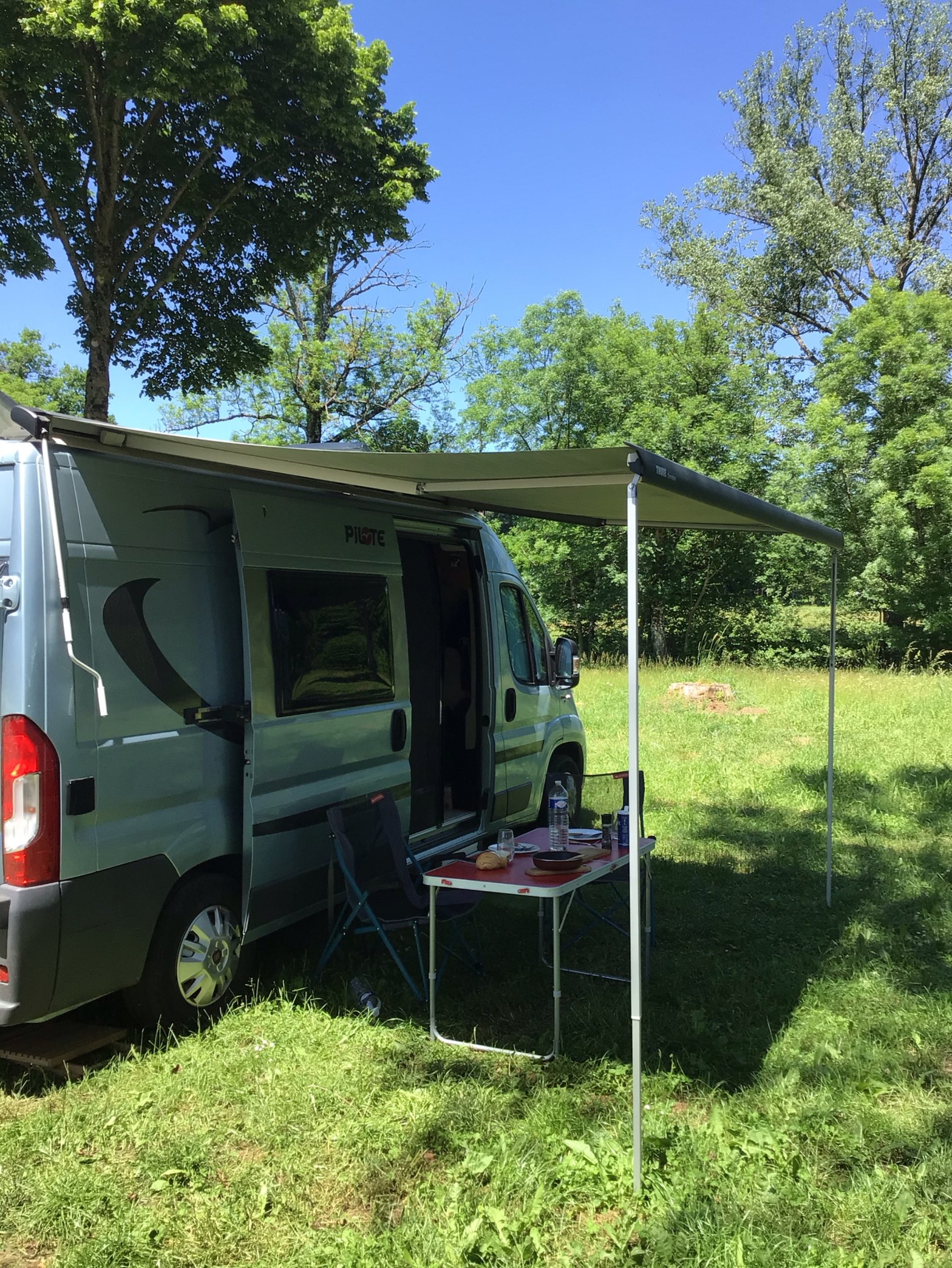 The insistent clanging of the seven o’clock bell eventually penetrated my sleep and by degrees I began to be aware of other morning sounds. The raucous, boastful crowing of a cockerel. The trilling of a songbird heralding, rather too gaily I thought, another warm, sunny day. Awake now, I could hear the call of a cuckoo in a distant wood. The smell of somebody’s morning coffee mingled with the breeze and drifted in through the window. Through the ceiling hatch of the van I watched the grey mist evaporate to be replaced by an ever intensifying blue. Finally, shafts of sunlight started to work their way through the little gaps between the window blinds and landed in odd shaped splashes on the wall behind my head. I slid open the door of the van and stepped out onto the dewy grass. The air was still cool but, out of the shade, the sun was already hot. I let the warmth soak into me for a few minutes, basking like a lizard charging itself up for the day ahead.